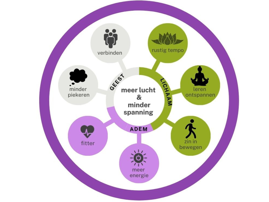 Ons programma is opgebouwd rond een holistische aanpak van lichaam, adem en geest. We geloven dat deze drie elementen onlosmakelijk met elkaar verbonden zijn en dat juist die verbinding maakt dat je stap voor stap meer ruimte en ontspanning kunt ervaren.
